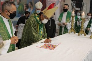 Na noite do sábado, estivemos todos conectado no canal do You Tube ( https://www.youtube.com/watch?v=KUgcoWhtDLM )para celebrar a Santa Missa em celebração aos 50 anos do serviço escola EJC, presidida pelo Dom Nelson Francelino Ferreira (Bispo da Diocese de Valença/SP), Presidente da Comissão Episcopal Pastoral para Juventude da CNBB, na oportunidade ele assinou o Documento Nacional do serviço escola EJC no Brasil, momento que se inicia a unidade do serviço escola EJC na Igreja do Brasil.