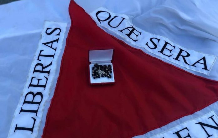 O padre brasileiro Alexandre Awi Mello, secretário do Dicastério para os Leigos, a Família e a Vida, entrega a bandeira de Minas Gerais ao papa. Foto: Maria Emília Duartes/Jovens Conectados